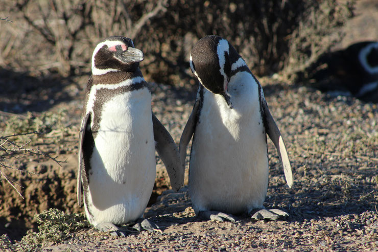 Les manchots de Magellan, que l'on peut distinguer des manchots du cap, à leurs deux franges noires, au lieu d'une, au niveau de la poitrine, peuplent les côtes de la Patagonie, offrant un spectacle charmant avec leurs démarches maladroites.