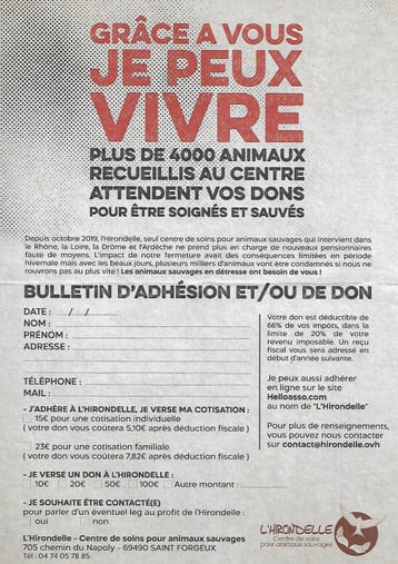 Le centre de soins pour animaux sauvages "L'hirondelle" situé à Saint Forgeux dans le Rhône et qui accueille plus de 4000 animaux sauvages blessés tous les ans, a urgemment besoin de subventions pour pouvoir pouvoir soigner et sauver tous les animaux qui ont été recueillis. Merci de leur venir en aide en participant à leur cagnotte en ligne. (même un petit don est le bienvenu) https://www.helloasso.com/associations/l-hirondelle-centre-de-soins-pour-animaux-sauvages/collectes/urgent-sans-vous-je-suis-mort ou en envoyant votre règlement accompagné du bulletin ci-joint. Vous trouverez toutes les informations concernant l'association l'hirondelle sur ce même lien.