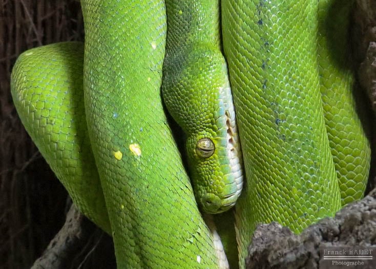 Endémique d'Indonésie, mais également d'Australie et de Nouvelle-Guinée, le python vert, reconnaissable à sa couleur caractéristique, est un serpent arboricole. Pouvant atteindre plus de 2 mètres pour les femelles, le python vert dont le régime alimentaire est constitué principalement de petits mammifères et d'oiseaux, a une vie plutôt nocturne et fréquente les forêts tropicales, jusqu'à 2000 mètres d'altitude. Se servant de sa queue préhensile pour capturer ses proies et les immobiliser,