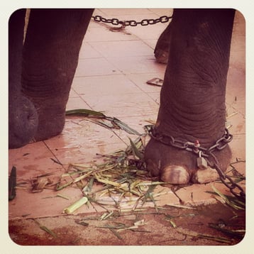 Malaisie, photos prises dans une zone de transit d'éléphants sauvages récupérés par les autorités. Ils récupèrent des animaux issus de conflits avec des villageois ou dans des plantations d'huiles de palme. Cette femelle était séquestrée avec son petit dans une cage sordide et minuscule. La bas, beaucoup d'éléphants étaient enchaînés. Les autorités ne savaient pas où relâcher ces 2 individus car il n'y a plus assez de place pour contenir les animaux dans les forêts malaisiennes aujourd'hui. Il faut savoir que la Malaisie est le pays qui a subi la plus forte déforestation au monde entre 2010 et 2012.
